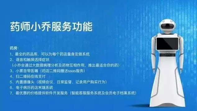 小乔机器人是一家以机器人软硬件研发为核心,集生产、销售于一体,拥有行业领先的智能软硬件一体化平台的国家高新技术企业,拥有自主知识产权和核心技术,曾获多项国家专利。其中“药师小乔”是一款药店智能机器人,定位为执业药师助手。运用了“大数据+人工智能+云计算”等智能技术,具有语音交流、症状分析、智能选药、自主学习,人脸识别,指纹识别,便于新增会员等功能。