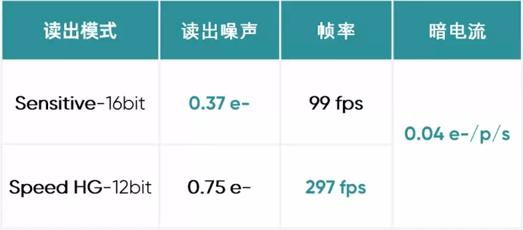帧率:297fps@4.2MP、读出噪声:0.75 e-、满阱:1Ke-