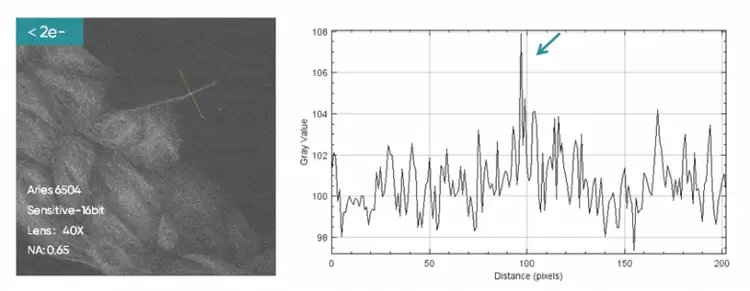 如图3所示,在光信号为平均20光子/像素的条件下,Aries 6504能够清晰地捕捉到弱信号。该模式特别适合如神经科学高速电压成像、钙离子成像等同时要求灵敏度和速度的成像需求。