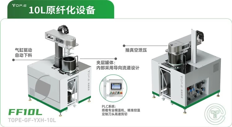 夹层罐体搭载专业模温机,内部采用导向流道设计实现热交换效率最大化,全程精准调控原纤化过程温度,根治工艺控温难、材料稳定性差的行业顽疾;集成 PLC 智能控制系统,精准调控桨叶旋转速度(0-35m/s 自动可调)并实时监测,低速混料至高速剪切纤维化流程可无缝衔接,无需人工干预,确保生产效率提升,缩短技术落地周期。