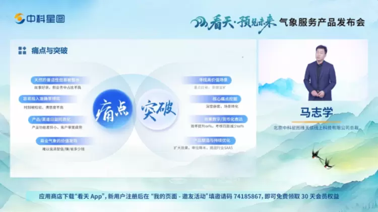 “为美好生活提供最好的气象服务,联合生态伙伴构建繁荣产业生态。”北京中科星图维天信线上科技有限公司总裁马志学作《从“天”出发:解码看天气象服务新生态》主题报告,介绍了“看天”产品的研发理念与发展中的创新突破。他表示,“看天”始于对用户需求的深刻洞察,不断挖掘核心痛点,寻找高价值场景,成于持续迭代的技术创新,要服务好大众用户,赋能千行百业。星图维天信公司也在发展过程中,实现了从气象观探测基础设施,到气象信息工程,再到气象信息服务全产业链覆盖。