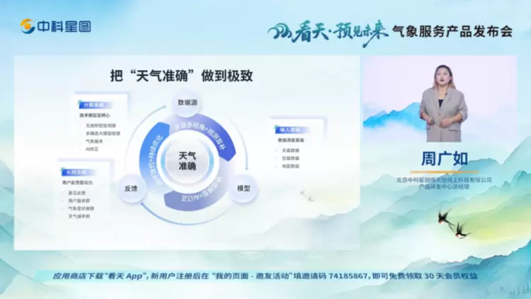 “把‘天气准确’做到极致,从‘查天气’到‘懂生活’全场景覆盖。”北京中科星图维天信线上科技有限公司产品研发中心总经理周广如带来《看天App智慧生态,科技领航》产品解读,用实际的生产生活场景,详细剖析了看天为各种场景带来的赋能。她表示,看天把“精准”藏在细节里,把“看不见的风险”变成“可预防的安心”,把“偶然邂逅”变成“精准奔赴”,让气象服务更有温度。