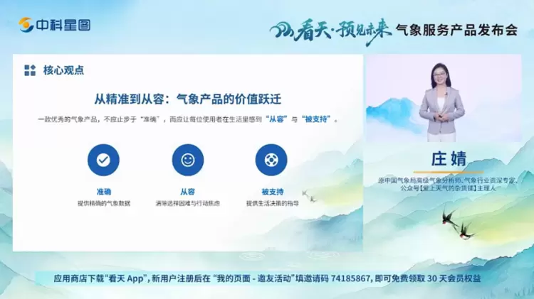 中国气象局原高级气象分析师、气象行业资深专家庄婧则从专业维度解读,分享了她与看天的故事以及对行业的思考。她认为,一款优秀的气象产品,不应止步于“准确”,而应让每位使用者在生活里感到“从容”与“被支持”,气象服务的未来要深耕场景化。看天App将专业数据“翻译”为行动,其中气象星球、健康预报、90天超长预报等诸多功能,帮助用户跨越从“知道”到“做到”的鸿沟。她希望“看天”能继续深耕,给更多人、更多行业,带来确定的从容和支持。