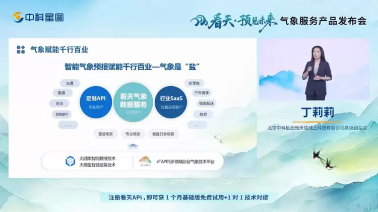 丁莉莉表示,看天产品体系提供专业的气象服务,包含城市实况类、灾害预警类、天气图层类、低空保障类、生活服务类等基础类产品品类,可满足普适场景、专业场景、垂直行业场景的应用需求,并在交通、航空、低空、能源、环保、农业、水利、生态等领域有成熟的产品和解决方案,希望赋能千行百业。