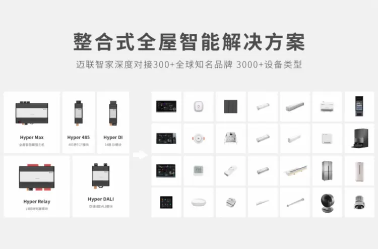 路创选择与迈联智家达成战略合作,核心源于对迈联连接能力与生态整合实力的高度认可。迈联智家秉持着万物互联的理念,致力于打造更加开放的全屋智能生态系统,现已实现300+全球知名品牌,3000+设备类型的无缝接入,涵盖家电、影音、安防等多个品类,为用户提供更加多元化的整合式全屋智能解决方案。