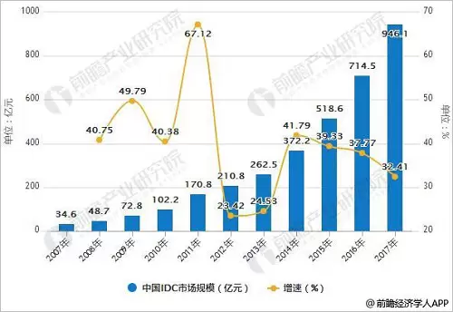 2017年中国IDC市场总规模为946.1亿元,同比增长率32.4%,增长率放缓5.4个百分点。IDC市场规模的绝对值仍然保持增长,我国IDC市场正在从高速发展期过渡向成熟期,客户需求更加明确清晰,在采购IDC业务时能够准确评估实际需求;同时,IDC服务商也保持均速扩张原则,稳步开拓市场。市场供给双方均理性处理采购需求与供给能力,这标志着中国IDC正发展为专业、合规、良性的市场。