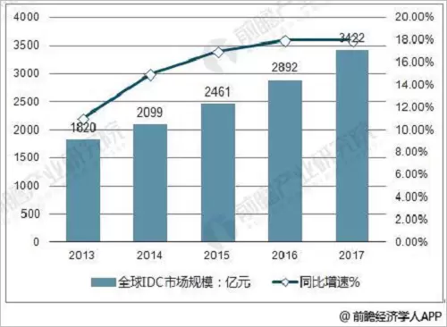 2016年全球IDC市场规模达到451.9亿美元,较上年同期17.5%。美国和欧洲地区占据了全球IDC市场规模的50%以上。其中,移动互联网领域快速发展和云计算技术的广泛应用带动数据存储规模、计算能力以及网络流量的大幅增加,是保持IDC市场增速提升的主要原因。