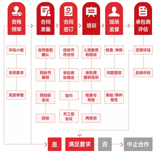 3.关口前移:建立承包商全生命周期管理机制,加强承包商源头管理,加强承包商预选择要求,选择承包商时将安全绩效纳入考察项目,在合同签署阶段明确告知公司安全管理要求。在承包商入场阶段对方案、机具设备及关键岗位人员把关,保证能岗匹配;避免按行政管理和经验管理;