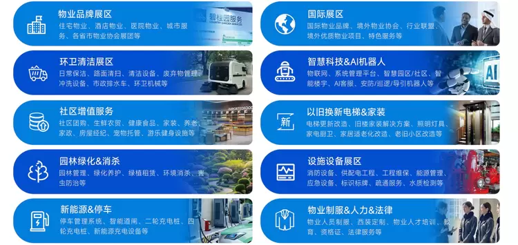 第七届广州物博会将打造2.2万平方米展览面积,精心规划了十大主题展区,包括品牌物业展区、国际展区、环卫清洁展区、智慧科技&AI机器人、社区增值服务、新能源&停车、园林绿化&消杀、设施设备展区、以旧换新电梯&家装、物业制服&人力&法律,全方位展示物业行业的最新成果与发展趋势。将汇聚400多家上下游优质参展商,同期举办20+场专题论坛及赛事活动,预计将吸引60000+人次专业观众人次到场参观采购交流。
