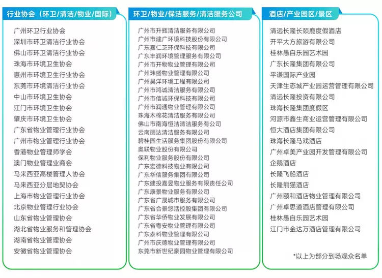 在这场行业盛宴中,将汇聚广环厂、升辉清洁、盈峰环境、有鹿机器人、欧卡智铂、嘉得力、麦斯环保、得万贸易携德国卡赫和高仙机器人、路吉智慧、梁玉玺、水艺集团、高臣环保、嘉仁芝、鸿诚清洁、玮盛物业、丰润环境、昊洋环境、开物物业、易彻、汉德等知名品牌企业,以前沿的创新产品、优质的解决方案与专业的服务体系,必将成为展会的亮点之一。