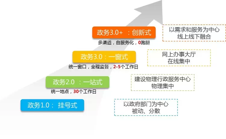 中国政务服务从传统的挂号式办公迈向创新式云服务,历经了30多年的演变。自20世纪80年代起中国引入办公自动化概念,从“三金”(金桥、金关、金卡)工程发展到“十三金”(金桥、金税、金关、金财、金卡、金审、金盾、金保、金农、金水、金质等)工程,在垂直领域加强监管、提高效率和推进公共服务取得一定成效,但同时也存在网上政务服务的标准化规范化程度不高、网上政务服务平台不互通、线上线下联通不畅等问题,为进一步加强全国一体化的政务服务改革,2016年,中国政府提出了“一号一窗一网”的互联网+政务服务建设目标,各地市结合本地现状,统筹推动本地区本部门网上政务服务平台建设,积极开展政务服务相关体制和应用服务创新。目前我国政务服务大部分地区处在一窗式阶段,有部分领先城市尝试业务创新。