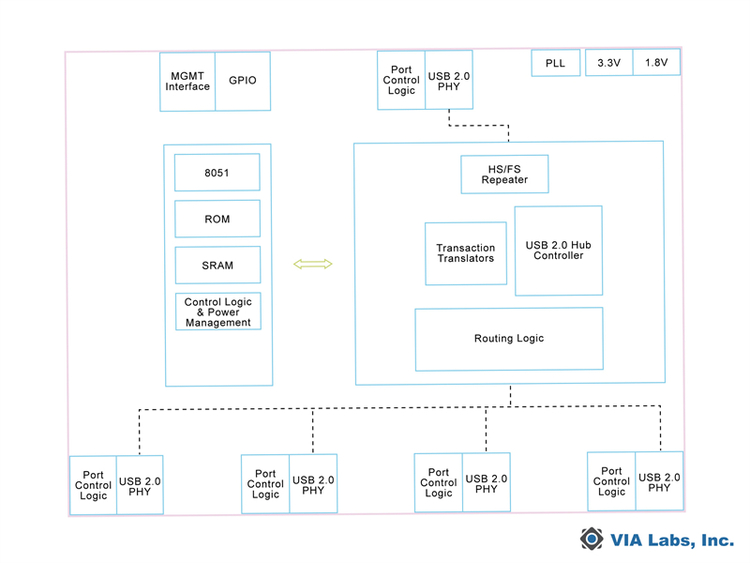 VL123 为即将推出的 4 埠 USB 2.0 集线器控制芯片,有别于 VL122 的 Single Transaction Translator(STT)架构,VL123 采用了 Multiple Transaction Translator(MTT)架构,能显著提升多个 USB Full-Speed 装置同时运作时的传输效能。VL123 支持与 VL122 相同的弹性化设定方案,透过 SMBus 或 EEPROM 进行管理,并与 VL122 封装针脚完全兼容,方便设计升级。样品预计于2026年第二季提供。