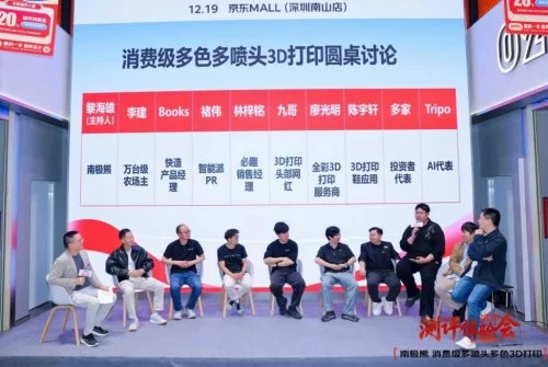 在圆桌论坛环节,3D打印设备厂商、农场主代表、材料厂商代表、应用服务商代表、AI 3D大模型代表,投资人代表以及圈内的头部网红共聚一堂,围绕消费级3D打印的发展趋势展开了深入讨论。嘉宾们普遍认为,多头、多色3D打印正成为消费级3D打印机突破的核心方向。这既是明确的技术升级路径,通过增加工具头来实现高效多色输出与多材料兼容,解决传统设备效率瓶颈,同时也大幅减少了材料浪费,精准呼应了市场需求变化,用户不再满足于单色打印,转而追求更复杂的色彩表现与实用功能。京东3C数码也正努力将这一技术趋势从行业讨论推向大众视野,缩短其市场普及的进程。