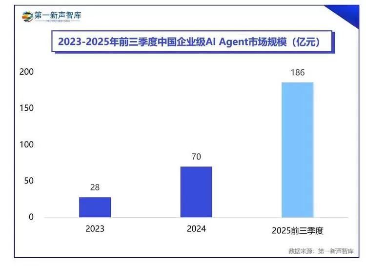 报告指出,2025年被视为“AI Agent元年”,前三季度中国企业级AI Agent市场规模已达186亿元,同比增长超220%。市场核心特征从早期的技术竞争转向生态与实效的博弈,企业采购更关注Agent与业务场景的深度融合。