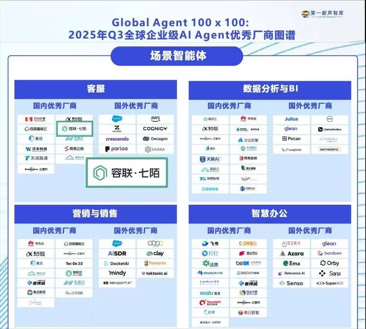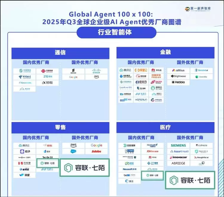 近日,第一新声智库发布《Global Agent 100 x 100:2025年Q3全球企业级AI Agent优秀厂商图谱》,容联七陌凭借其在客服场景智能体与医疗、零售行业智能体的创新实践,入选该榜单。