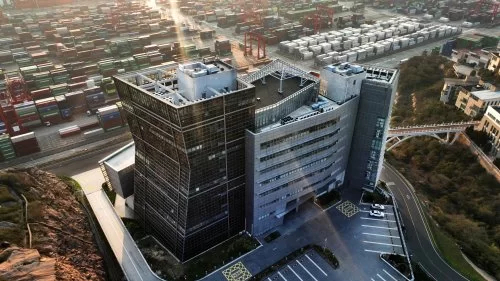 该建筑毗邻繁忙的码头,常年经受海风盐雾侵蚀,加之货轮与运输车辆尾气排放,玻璃幕墙表面附着了大量难以清除的油性复合污渍。同时,建筑采用了前卫的V型、折角设计,立体感强,但同时也形成了众多传统清洗方式难以触及的结构死角。