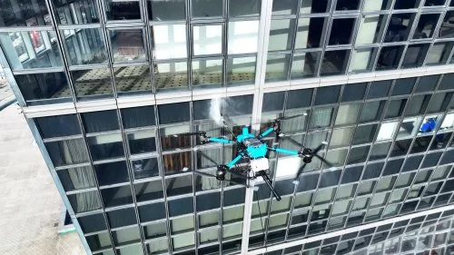 为了确保每一寸幕墙都能重现透亮,C10系统采用了独特的扇形宽幅清洗技术。它能在作业面上形成50cm×3cm的矩形水幕,配合无人机稳定的贴近飞行能力,不仅能高效冲刷掉已经软化的污渍,更能让高压水流均匀冲刷到凹型槽、结构缝隙等死角,实现了真正的全覆盖清洗。