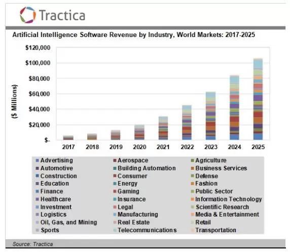尽管存在这些挑战,但根据Tractica/Ovum的报告,AI的商业前景比以往更加光明。Tractic/Ovum预测,全球AI软件收入将从2018年的81亿美元增至2025年的1058亿美元。这次预测相比2017年底发布的预测有了很大的提高,因为这一次新增了多个行业的实际使用场景,并且包含更多针对若干领域主要使用场景的指导意见。