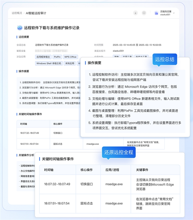 审计功能上,向日葵提供完整的远控日志与云录像,支持多维度审计。其AI智能远控审计功能可自动分析远控过程并生成审计报告,大幅减少人工核查时间。