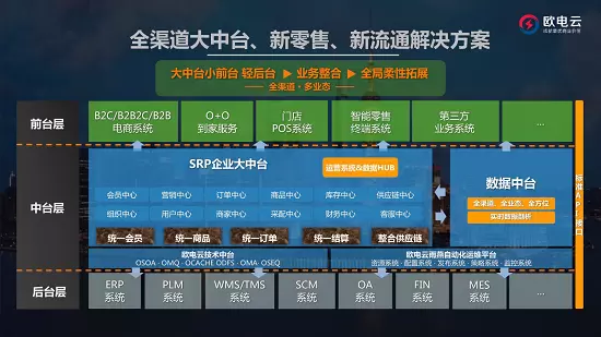 区别于传统互联网+的线上线下数据对接、各系统集成的模式,欧电云SRP大中台,以消费者为中心,将企业前端业务与后端管理全面整合,集B2B、B2C、B2B2C、O+O、ERP等于一体,涵盖了平台电商、综合电商、垂直电商、百货、购物中心、卖场、商超、便利店、无人店等多种业态,营造多业态、全品类、全渠道的生态闭环,打造业务中台、数据中台、技术中台真正融合的一体化全渠道平台,真正实现从前端到终端的智慧运营的管理场景。