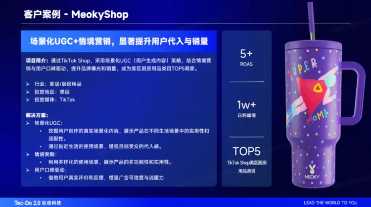 作为进军美国市场的厨房品牌,MeokyShop面临的挑战是如何让实用厨具摆脱冰冷的“工具”属性,转化为用户追求品质生活的伴侣。钛动科技将营销重心从品牌宣讲转向对海量用户真实场景内容(UGC)的挖掘、放大与再组织,结合情景营销与用户口碑提升品牌曝光。通过工具识别具有潜力的高互动UGC内容,系统化地在TikTok等平台挖掘用户创作的真实场景化内容,展示产品在不同生活场景中的实用性和适配性,通过贴近生活的使用场景,增强目标受众的代入感。进而将筛选出的优质UGC作为核心广告素材,进行精准信息流投放;围绕多样化的使用场景,展示产品的多功能性和实用性,将散点式的UGC整合为主题化的内容集合,深化品牌与特定生活方式的关联;借助天然具备“生活气息”和“信任背书”的用户真实评价和反馈,增强广告可信度与说服力,以用户口碑驱动销量增长。最终成功驱动品牌日广告消耗峰值突破1万美元峰值,实现超过5的ROAS(广告支出回报率),助力MeokyShop快速跻身 TikTok Shop美区厨房用品类目TOP5。