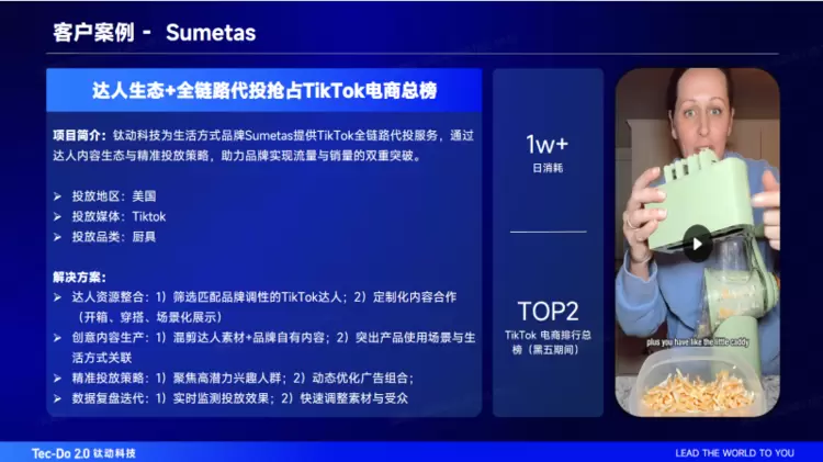 对于厨具品牌Sumetas,目标是在竞争白热化的美国市场,快速建立“高品质烹饪生活”的品牌认知,并在关键销售节点实现爆发。钛动科技为其部署了 “精准达人筛选+深度内容共创+全链路数据投流” 的一体化方案,构建一个可持续的达人内容循环。整合达人资源,严格筛选一批符合品牌调性的专注美食、生活美学的垂类TikTok达人进行长期合作,与达人共创“厨房美学”等系列定制化内容;在“黑五”大促期间,钛动科技将达人内容与品牌自有素材智能混剪,形成海量、多元且高质量的广告素材库,将开箱、穿搭、场景化展示等高质量共创内容作为核心资产,突出产品使用场景与健康生活方式的高度关联;通过钛动科技的全链路代投服务进行精准人群触达与高效转化,投放系统实时优化广告组合的转化效率,动态分配预算,确保最具吸引力的叙事内容获得最大曝光实现精准投放;实时监测投放效果,快速调整素材与受众,进行数据复盘迭代。最终实现日消耗稳定超过1万美元,成功助力Sumetas在黑五期间的TikTok电商总榜冲击至TOP2 席位。达人生态不仅带来了流量,更以其专业、可信的“品味背书”,为Sumetas贴上了“品质生活创作者”的鲜明标签,实现了品牌价值的提升。