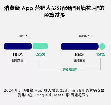 过度依赖“围墙花园”会导致用户触达面变得更加狭窄,就如同在广阔的深林中,只反复耕种少数几颗树木,从而错过了整片森林多样性的机会。Moloco 在今年发布的《开放互联网驱动效果提升》研究报告中,提及消费级 App 的营销人员仅将 12% 的广告支出投入到大型“围墙花园”之外;同时,一项研究也证实,有近 50% 的消费级 App 营销人员仍未尝试在 Google 和 Meta 之外进行过广告投放。