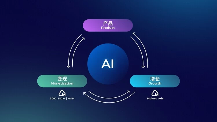 面对机会更多的“开放互联网”的领域,打破孤岛思维再也不是一句口号了,而是构建自我强化的增长系统目标。Moloco 提出的“增长飞轮”,以 AI 为核心驱动,连接产品、数据、流量与变现,形成闭环。这一系统将非游产业的增长痛点,通过产品矩阵、技术驱动与场景覆盖,转化为闭环的增长动力。