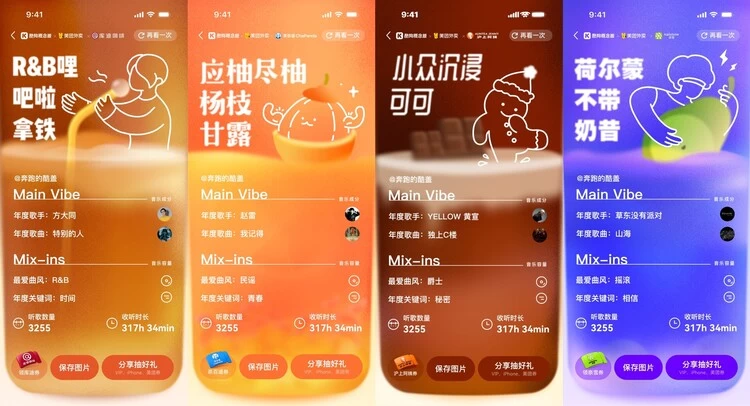 此次年度报告突破单纯数据统计,联合美团外卖、库迪咖啡、茶百道、沪上阿姨、奈雪的茶等品牌,定制如“R&B哩吧啦拿铁”“应柚尽柚杨枝甘露”“小众沉浸可可”“荷尔蒙不带奶昔”等趣味音乐特调数据,用户分享听歌报告后可领取合作茶饮券兑换限定冬季暖饮,实现“让音乐被尝到”的跨界体验,打造“可品尝的音乐记忆”。