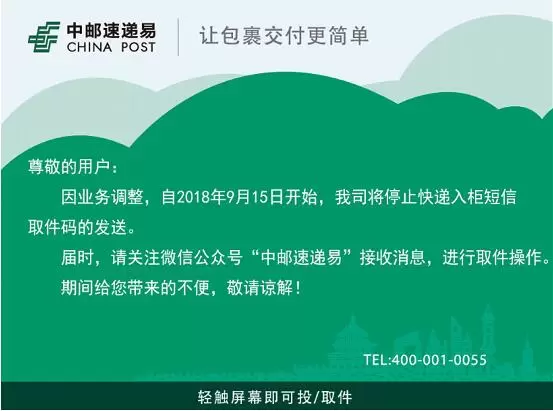 中邮速递易经过业务调整之后,用户只需绑定中邮速递易官方微信公众号即可收取取件通知,以及包裹或快递件的取件码。在此情况下,用户获取取件码的便捷性、安全性得到了保障。具体来看,对于未进行微信绑定的新老用户,中邮速递易仍将发送短信通知提醒用户及时取件,同时告知用户取件码需要通过关注中邮速递易官方微信公众号获取;对于已进行微信绑定的用户,中邮速递易将在官方微信公众号内直接推送取件码,并增加微信取件提醒服务,避免用户忘记取件。