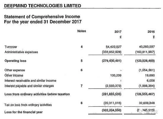 截至2017年12月31日,DeepMind持有现金和现金等价物97.5万英镑,账面上亏损4.98亿英镑。
