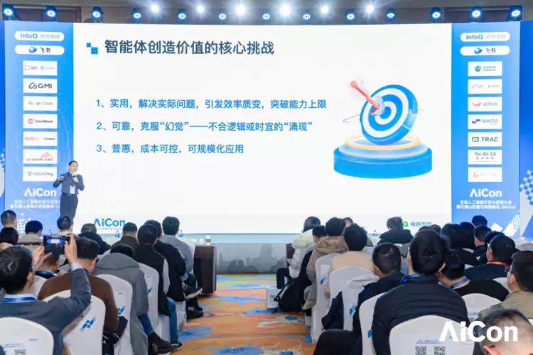 最后他指出,企业级智能体要真正进入生产,需要重构 job 与 task 的边界:由人负责目标设定与验证,把执行与探索交给智能体,在目标导向的计算范式下推动可信 Agent 的规模化应用。