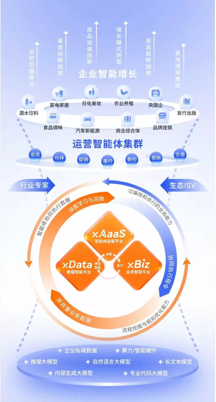 这一架构形成了独特的“飞轮效应”:xData提供高质量数据和行业知识图谱,xAaaS基于这些“燃料”生成智能策略,xBiz则负责将策略转化为具体业务动作,执行结果产生的数据又反馈回系统,驱动下一轮优化。三者协同,实现了从感知、决策、执行到复盘的完整闭环。