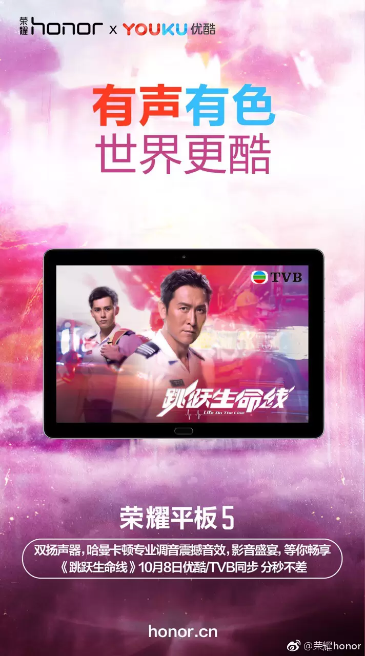 细看各家海报,先有芒果TV表示「大」有精彩,看剧追番更爽,表示荣耀平板5全高清大屏,能带来沉浸式现场体验;后有华为视频自家代言「声色」兼备,大屏看片更畅快,进一步传达荣耀平板5力展鲜活画质,细节尽收眼底的信息,此言必然不虚。