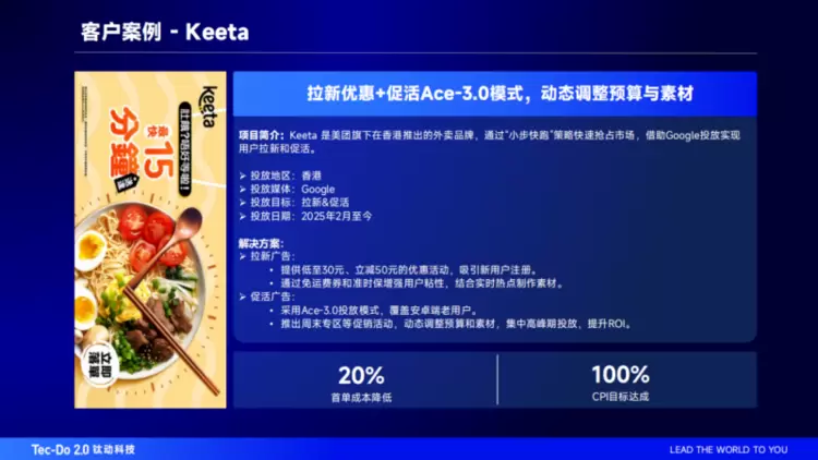 应对这些挑战,需要的不再是割裂的广告工具或人力堆砌,而是一个能够实时感知市场温度、动态调配资源、并自主优化用户触达路径的智能系统。钛动科技为Keeta在香港市场部署的,正是这样一套以 “双轨协同策略” 与 “Ace-3.0智能投放模式” 为核心的解决方案。