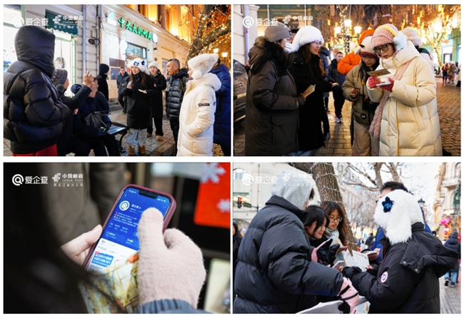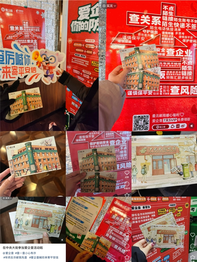12月19日,爱企查反诈宣传活动落地哈尔滨核心场景,在中央大街邮局向市民与游客派发爱企查&中国邮政联名明信片,将反诈知识与城市文旅记忆深度绑定。