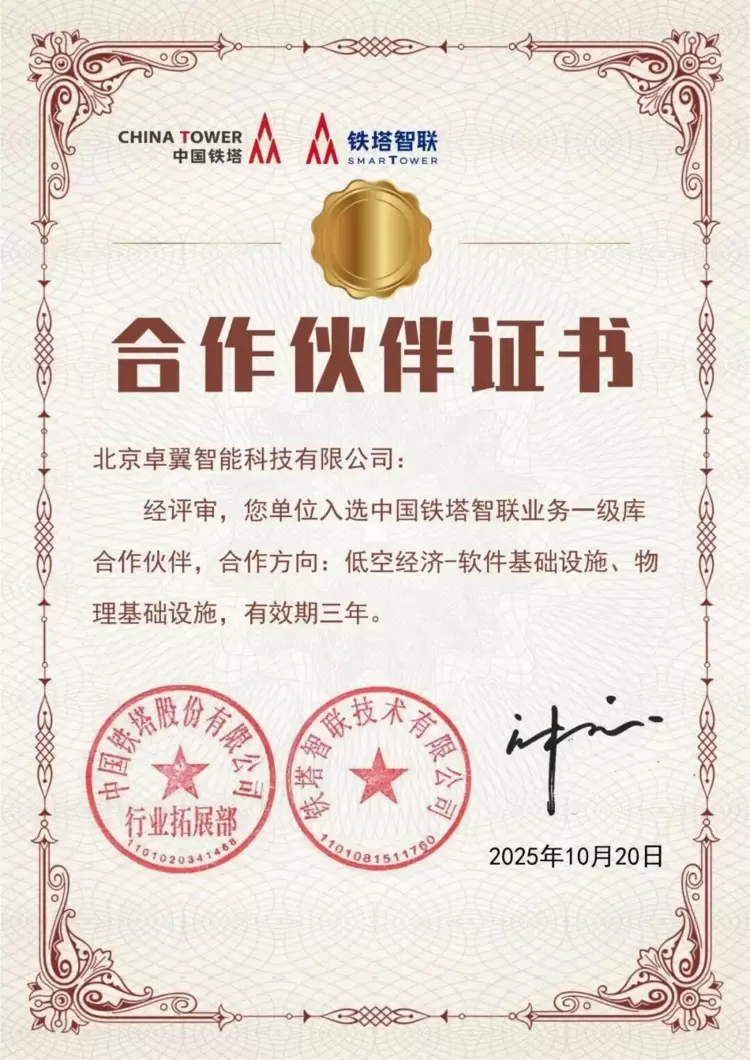 中国铁塔作为国家信息通信基础设施建设的“国家队”,其合作伙伴选拔标准直指“全链路创新能力”——这恰好与卓翼智能“军工技术-行业应用”的转化优势高度匹配。在全国仅41家企业入围、仅6家同时跻身两大核心场景的激烈竞争中,卓翼智能成功成为中国铁塔战略级合作伙伴。这种认可,不仅是对其技术实力的肯定,更意味着其将深度参与国家低空经济基础设施建设,与“国家队”共筑产业生态,推动低空经济规模化发展。