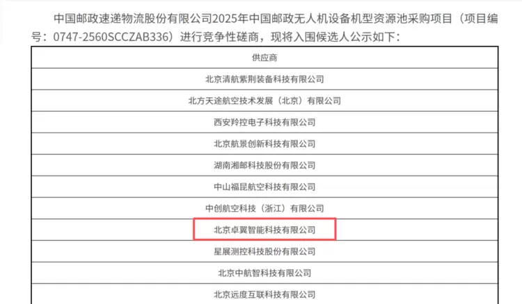 - 跻身“国家队”!卓翼智能成功入围中国邮政2025无人机设备资源池采购项目