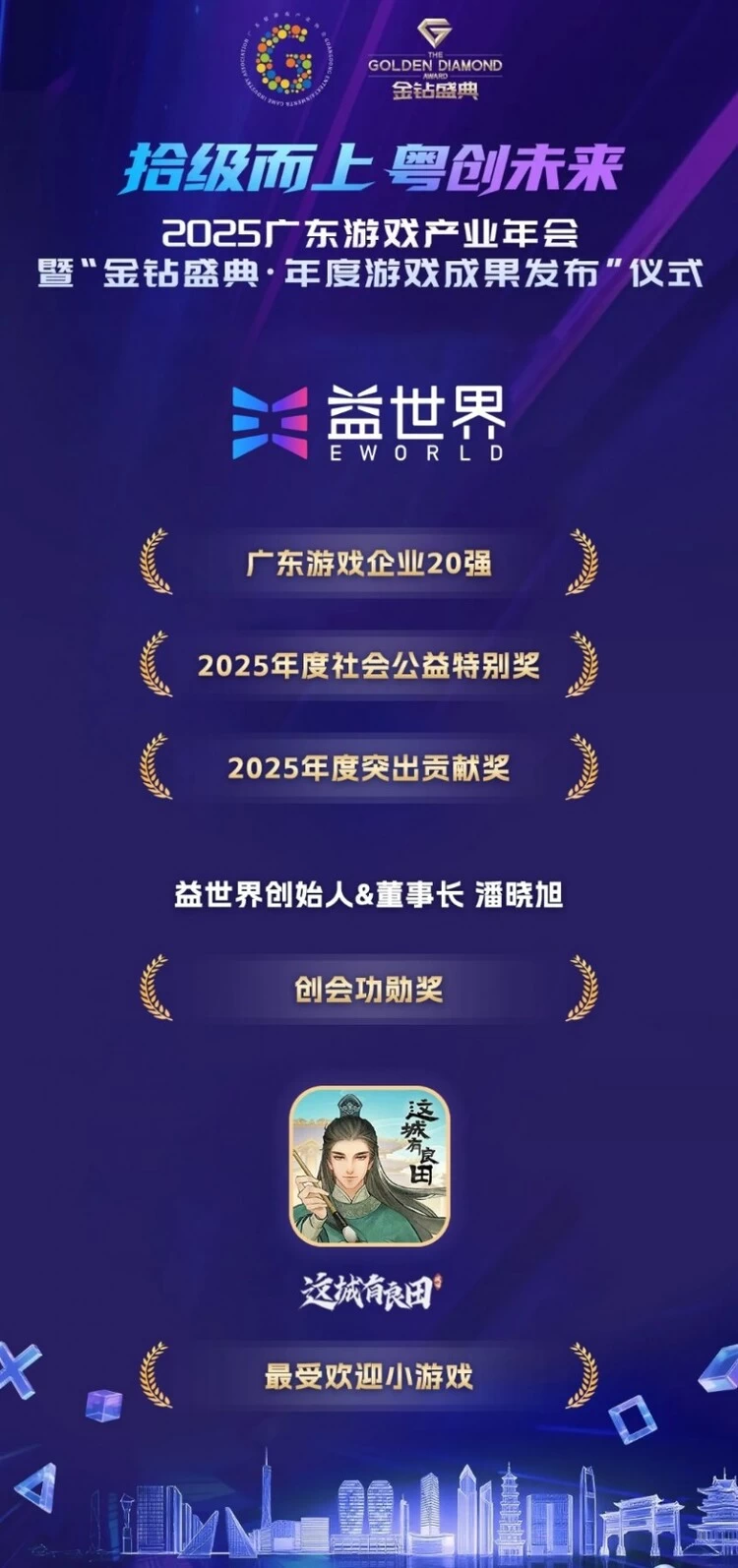 本届金钻盛典上,益世界不仅连登「广东游戏企业20强」,还同时获得「2025年度社会公益特别奖」、「2025年度突出贡献奖」;益世界创始人&董事长潘晓旭获「创会功勋奖」;旗下古风经营手游《这城有良田》成功蝉联「最受欢迎小游戏」奖项。