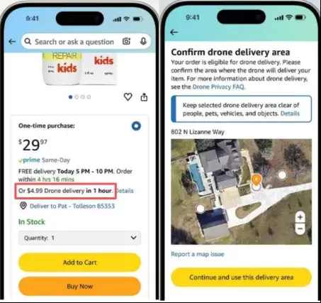 这一款新型无人机,是亚马逊在2024年11月才投入商用的“MK30”。它基于最新的电子地图和AI技术,无需事前实地勘测,也无需识别地面二维码,便可以精准投放包裹,其适用的配送场景,远远超出了以往“需要识别地面二维码”的旧式无人机。