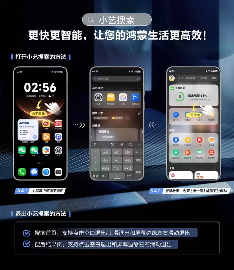 · 在智慧助手·今天(负一屏)持续下拉滑动,也可打开小艺搜索