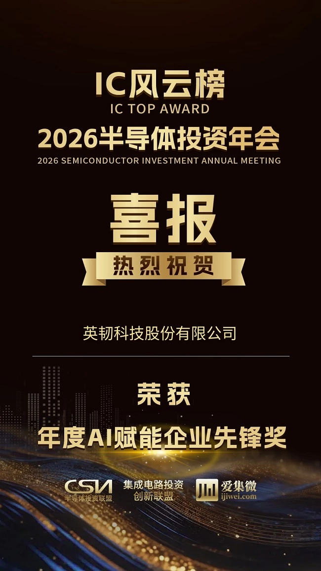 2025年12月20日,由半导体投资联盟和集成电路投资创新联盟主办、ICT知识产权发展联盟协办、爱集微承办的“2026半导体投资年会暨IC风云榜颁奖典礼”在上海前滩华尔道夫酒店成功举办。英韧科技股份有限公司(简称:英韧科技)荣获“年度AI赋能企业先锋奖”。