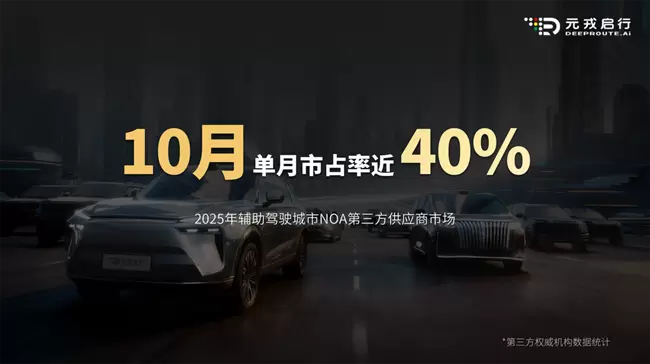 目前,元戎启行的工程化能力已趋成熟,为VLA模型的量产上车提供坚实基础。根据最新数据显示,元戎启行已交付20万辆搭载城市NOA(领航辅助驾驶)的量产车型,合作车型覆盖SUV、MPV、越野车等多个品类。根据权威机构数据显示,2025年10月,元戎启行在辅助驾驶城市 NOA 第三方供应商市场的单月市占率接近40%。