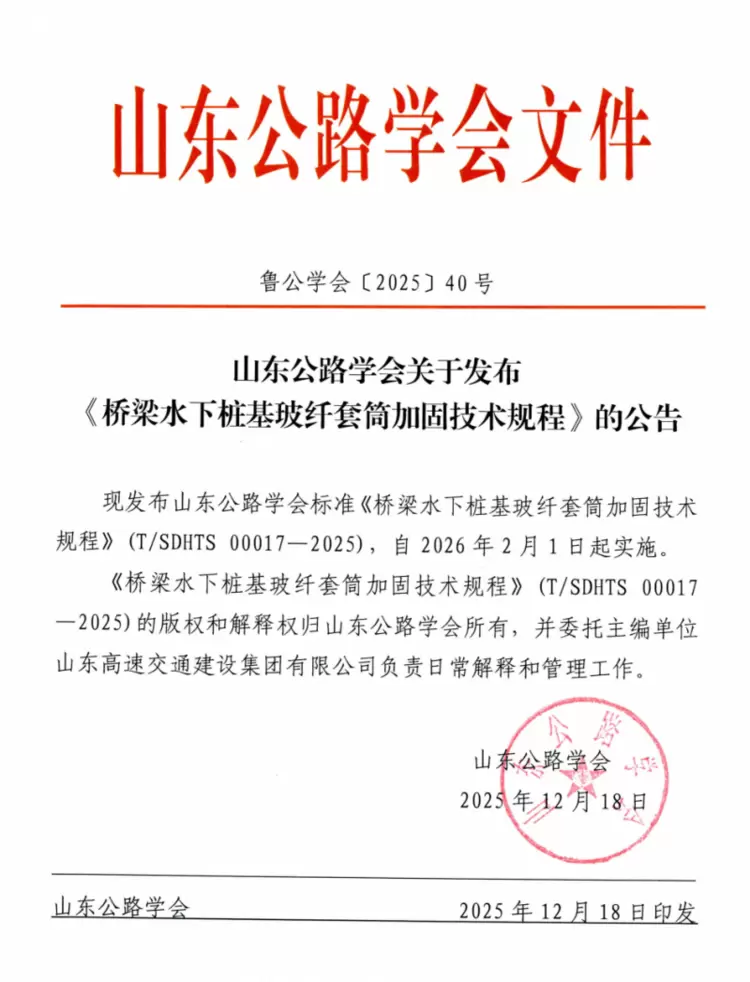2025年12月18日,山东公路学会正式发布团体标准《桥梁水下桩基玻纤套筒加固技术规程》(T/SDHTS 00017-2025),该规程将于2026年2月1日起实施。