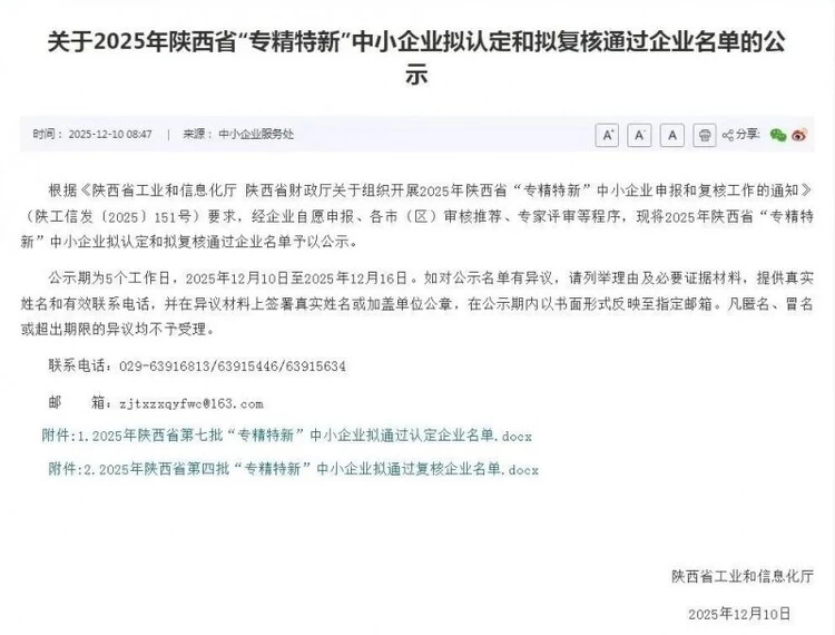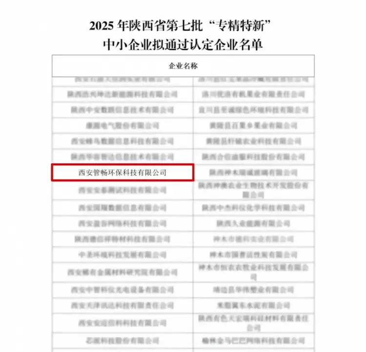 近日,陕西省工业和信息化厅发布了2025年陕西省“专精特新”中小企业拟认定和拟复核通过企业名单,并于2025年12月16日公示期结束。西安管畅环保科技有限公司正式被认定为“专精特新”企业。