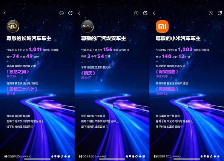 随着数智化不断融入生活,车载场景已经成为许多人听歌的重要场景。此次QQ音乐通过年度听歌报告,专门为车主用户梳理了年度音乐旅程——不仅呈现您在车上播放过的歌曲总数和总时长,还解析了早晚高峰时段的音乐情绪变化,描绘出车主车内的“听歌自画像”。