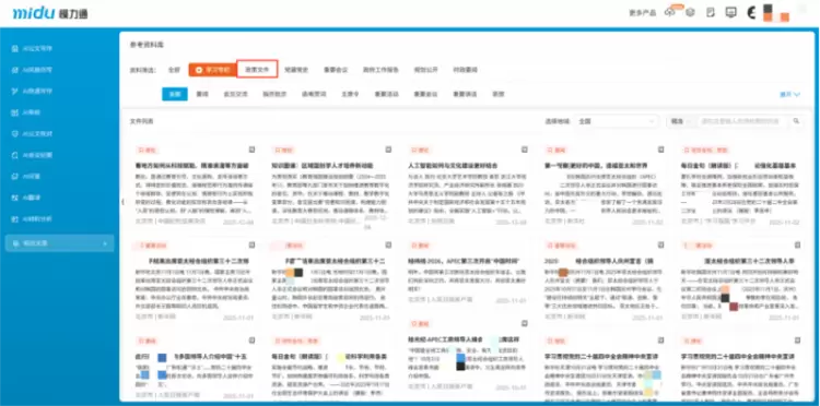 在使用上,该栏目支持按地区筛选、精准检索与语义检索,帮助用户快速定位内容,摆脱海量信息中的手动查找困扰。检索到的资料可直接用于AI写作、风格仿写等任务,还能一键收藏至个人知识库,形成知识储备,实现政策资料的高效查找与深度应用。