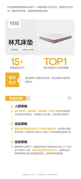 “在决策周期长、复购率低的耐用品赛道,如何打通‘种草’到‘拔草’的链路,实现高效转化,是所有品牌亟待破解的难题。”林芃品牌相关负责人表示。凭借对国人睡眠的深刻洞察与小红书生态的精准把握,品牌创新性地将“种草”与“种草直达”策略深度融合,并在2025大促期间交出亮眼成绩单:种草直达ROI突破15+,核心投放单品——云宿系列稳居全店销量TOP1,印证了消费者愿意用真金白银为“好产品+好内容”投出信任票。