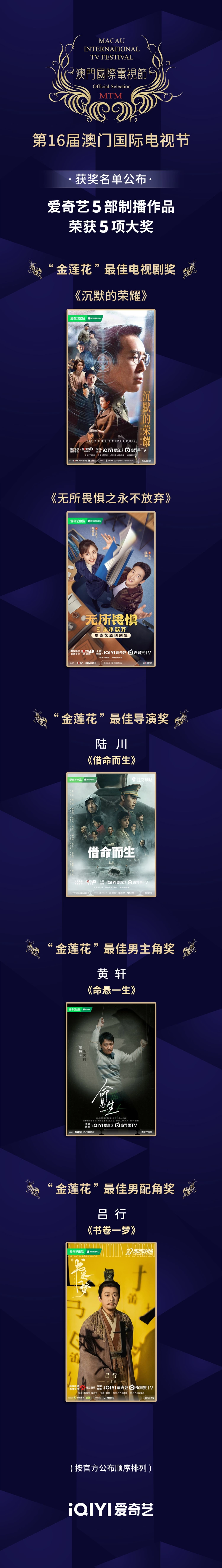 12月23日,第16届澳门国际电视节“金莲花奖”颁奖典礼在澳门美狮美高梅剧院举行,爱奇艺制播作品及主创共荣获五项大奖。《沉默的荣耀》《无所畏惧之永不放弃》摘得最佳电视剧奖,导演陆川凭借《借命而生》荣获最佳导演奖,《命悬一生》演员黄轩获最佳男主角奖,《书卷一梦》演员吕行获最佳男配角奖。