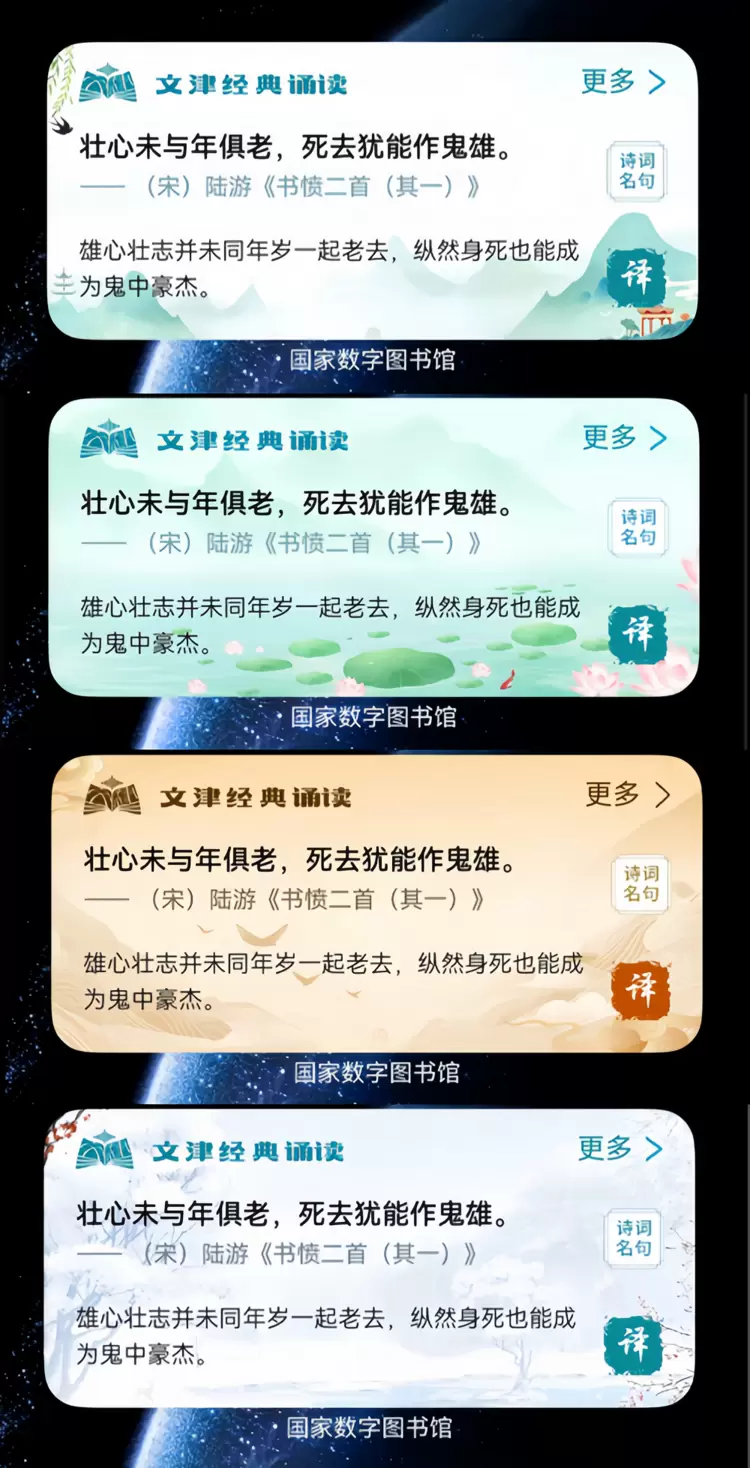 • 桌面服务卡片便捷更美观:长按App图标将“文津经典诵读”服务卡片添加至桌面,该卡片每日将推送一首经典诗词,配以诗词译文等内容。卡片设计还会随四季更迭动态更新主题,让日常知识积累更添生活温度。